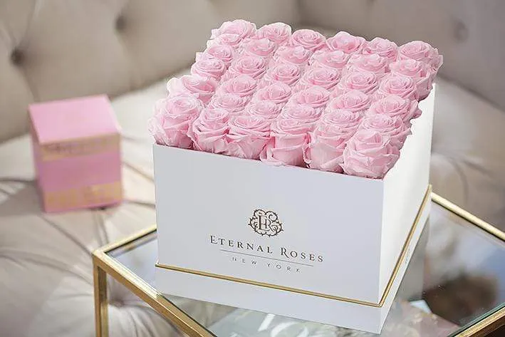 This elegant arrangement of preserved roses is displayed in an elegant gift box embossed with gold. Each collection holds thirty-six handcrafted, luxury roses, which can last up to three years. The Grand Lennox Gift Box from Eternal Roses is an elegant gift for birthdays, anniversaries, graduation or any occasion.