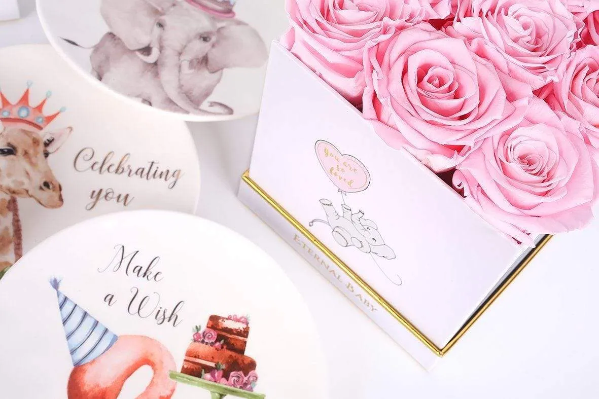 The most adorable baby shower gift idea! This rose gift box for babies is perfect for display in a nursery or as a gift for the mother of a new baby girl. This pink baby shower flower arrangement of preserved roses is displayed in an elegant white gift box. The rose gift box is printed with an adorable baby elephant. The square box contains nine light-pink luxury roses within the box. The preserved rose gift box for baby girl lasts for up to three years, which means it can be the centerpiece at a baby shower and decorate a nursery until the child is a toddler! Each luxury rose is handcrafted and a real, preserved fresh flower.