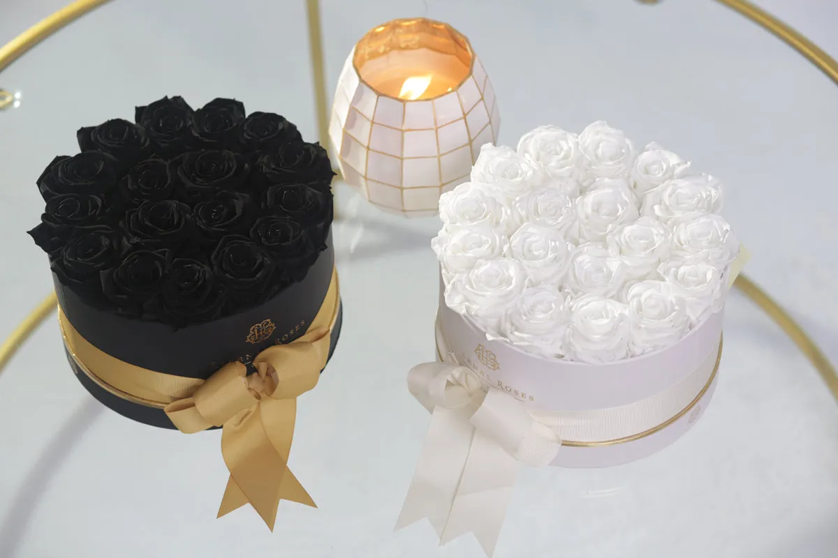 This elegant arrangement of Preserved Luxury Roses comes displayed in a black or white gift box trimmed with a customized ribbon. Choose from a wide variety of colors to celebrate any occasion, whether a birthday, anniversary, graduation, or even just because. Give the gift of preserved flowers and shop Eternal Roses today.